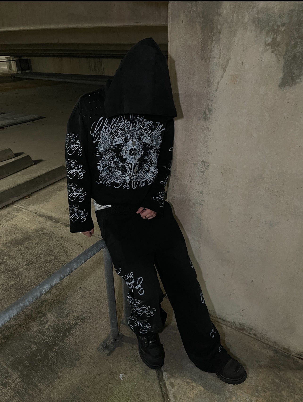 Drenched in darkness and forged with intention, this heavyweight 425 GSM hoodie is more than clothing — it’s armor for the misunderstood. Each piece is acid-washed for a unique, worn-in look that speaks of battles fought and survived. The cropped bottom and raw sleeve cuffs give a jagged, unapologetic edge, while strategic distressing throughout tells a story of beautiful destruction.